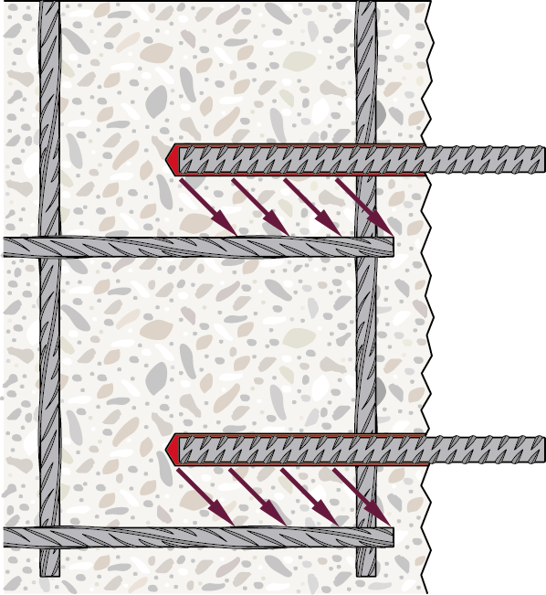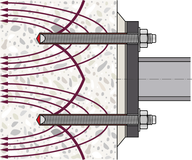 在錨栓理論中,來自鋼構(gòu)件(梁或柱)的荷載通過錨固定在混凝土上的錨板傳遞到混凝土結(jié)構(gòu)上。固定件的鋼構(gòu)件(粘合劑的螺紋桿)通過拉伸荷載或剪切荷載或兩者的組合將荷載轉(zhuǎn)移到現(xiàn)有混凝土構(gòu)件上。利用混凝土的固有抗拉強(qiáng)度是加固抵抗荷載的必要條件,這意味著脆性混凝土錐體破壞在錨栓理論設(shè)計(jì)中是可以接受和考慮的。